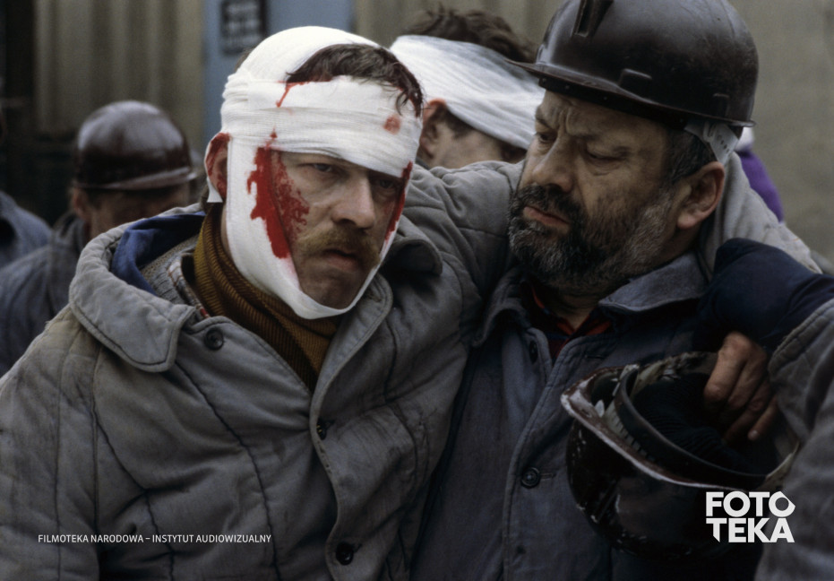 stan wojenny, kopalnia, górnik, krew, kask, ranny, opatrunek