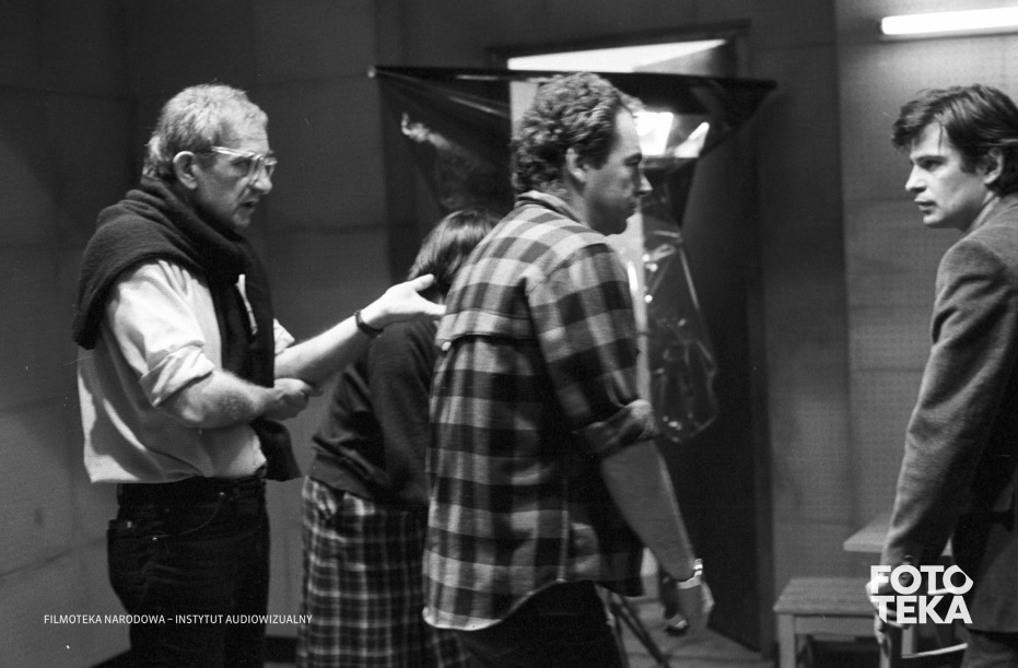 Opis: Werkfotos z planu filmu „Krótki film o zabijaniu” (1987), reż. Krzysztof Kieślowski. Od lewej: reżyser Krzysztof Kieślowski, operator Sławomir Idziak oraz aktor Krzysztof Globisz. Autor zdjęcia: Romuald Pieńkowski, czarno-biały negatyw, format 35 mm | On the set of “A Short Film About Killing” (1987), dir. Krzysztof Kieślowski. From left: director Krzysztof Kieślowski, cinematographer Sławomir Idziak and actor Krzysztof Globisz. Photo: Romuald Pieńkowski, black and white negative, 35 mm format