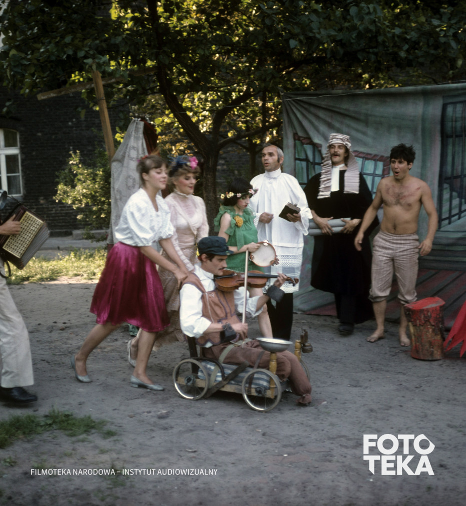 inwalidzi zob. niepełnosprawni, teatr, skrzypce, dekoracja, wózek