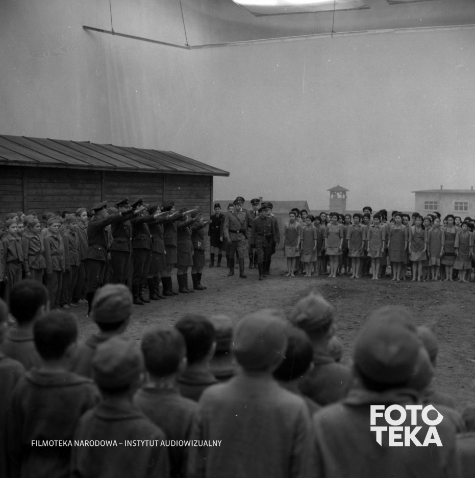 dzieci, obozy koncentracyjne, scenografia, dekoracja, atelier, zbiórka, hitlerowiec, salutowanie