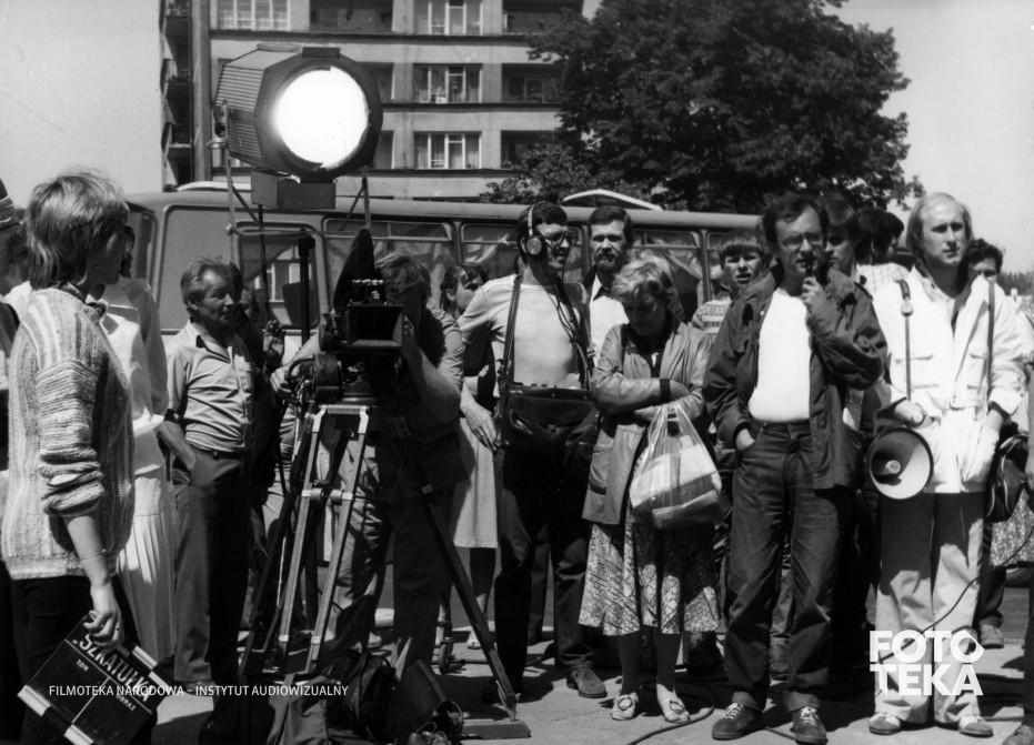 kamera, reflektor, tłum, klaps, megafon, statyw