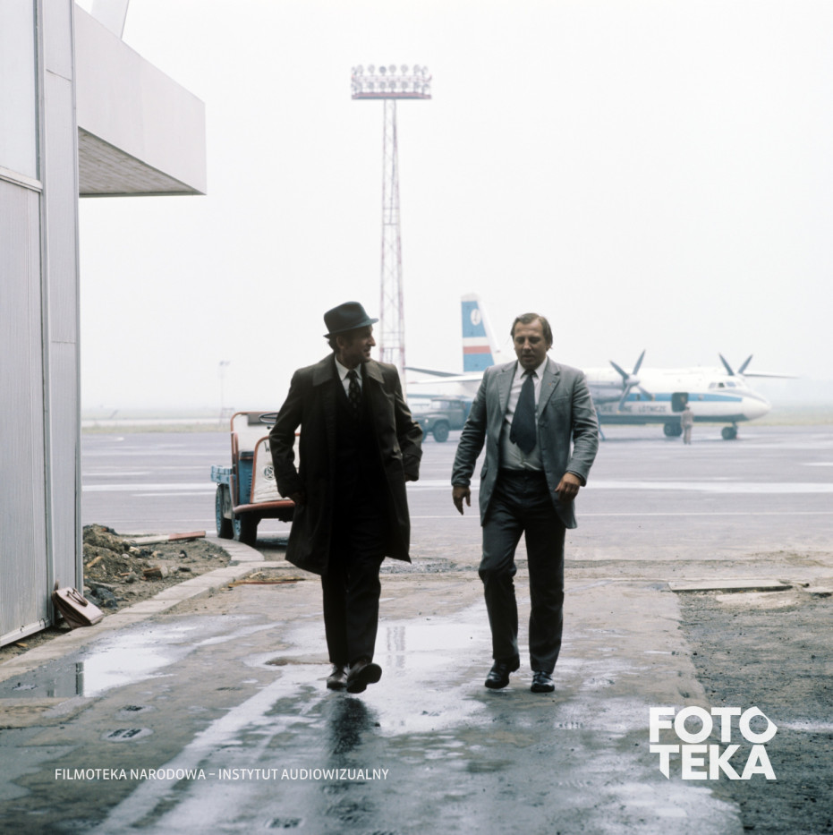 Opis: Fotos do filmu „Blizna” (1976), reż. Krzysztof Kieślowski. Od lewej: aktorzy Franciszek Pieczka i Stanisław Michalski na lotnisku. Autor zdjęcia: Romuald Pieńkowski, diapozytyw, format 6x6 | Film still from “The Scar” (1976), dir. Krzysztof Kieślowski. From left: actors Franciszek Pieczka and Stanisław Michalski at the airport. Photo: Romuald Pieńkowski, transparency 6x6 format