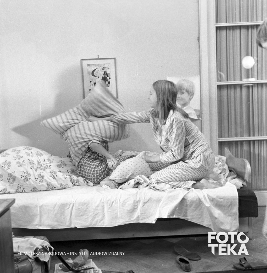 fotografia, zabawa, obraz, piżama , pościel, poduszka, pokój