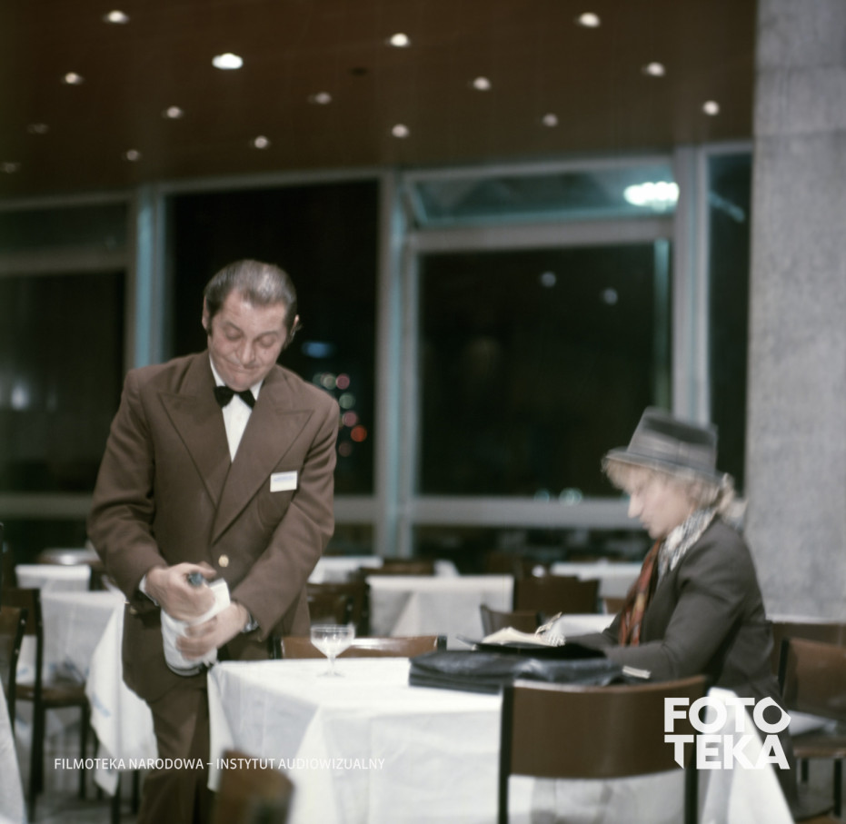 kapelusz, restauracja, kelner, szampan, torebka