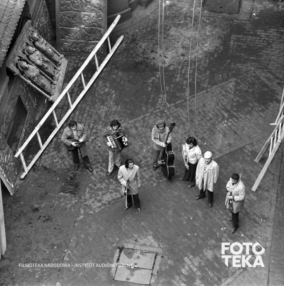 Opis: Fotos do filmu „Personel” (1976), reż. Krzysztof Kieślowski. Scena zbiorowa, orkiestra na podwórku. Autor zdjęcia: Stefan Kurzyp, czarno-biały negatyw, format 6x6 | Film still from “Personnel” (1976), dir. Krzysztof Kieślowski. Group scene, orchestra in a courtyard. Photo: Stefan Kurzyp, black and white negative, 6x6 format
