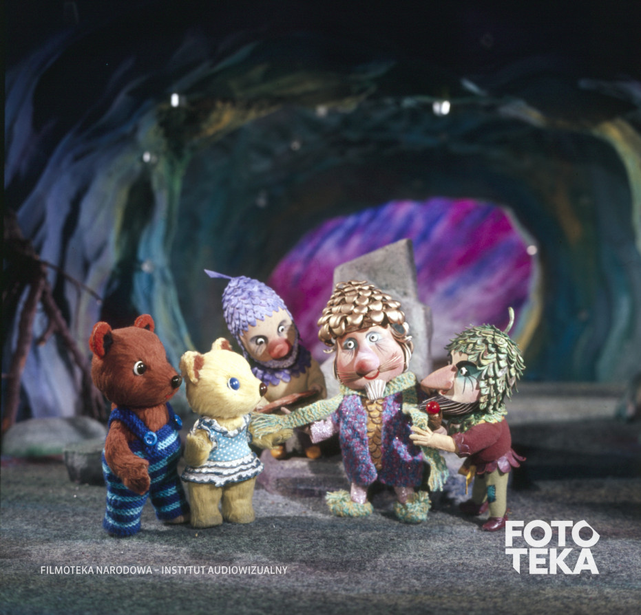 Opis: Fotos z animowanego serialu lalkowego dla dzieci „Trzy Misie”, powstającego w latach 1982-1986 w Studiu Małych Form Filmowych Se-ma-for w Łodzi. Zdjęcie z odcinka pt. „Podziemne królestwo” (1985), reż. Eugeniusz Ignaciuk, przedstawiające pluszowe misie Kubę i Misię oraz leśne krasnoludki w jaskini. Rodzaj nośnika: barwny negatyw, wymiary: 6 x 6 cm. | A still from the stop-motion puppet series for children The Three Teddy Bears (Trzy Misie), created from 1982 to 1986 at the Studio Małych Form Filmowych Se-ma-for in Łódź. Teddy bears Kuba and Misia, and some forest dwarfs in a cave. A photo from the episode Underground Kingdom (Podziemne królestwo, 1985), dir. Eugeniusz Ignaciuk. Type of medium: color negative, dimensions: 6 x 6 cm.