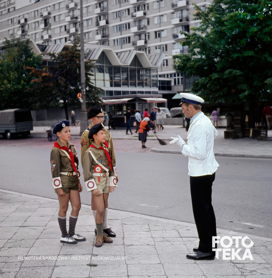 harcerstwo, milicja, mundur, blok, ulica, chłopiec, miotłaMiejsca