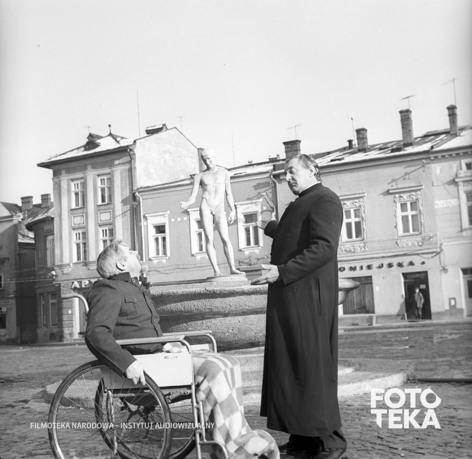 niepełnosprawni, wózek inwalidzki, rynek, sutanna, fontanna, ksiądz, rzeźba, miasteczkoMiejsca