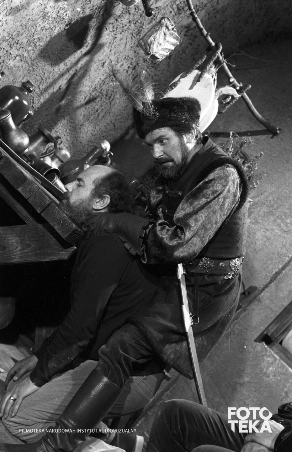 przemoc, szabla, stół, czapka, łysina, broda, pióra, dzbanek