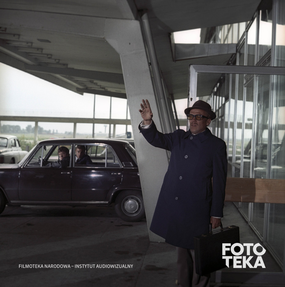 kapelusz, samochód, walizka, okulary, teczka, płaszcz, lotnisko, gestykulacjaMiejsca
