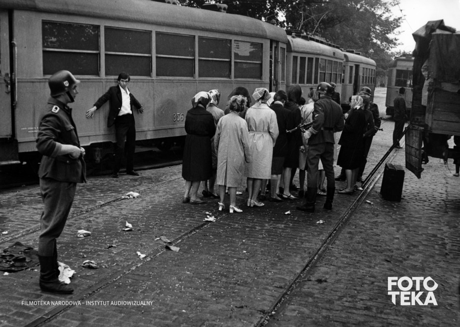 mundur, tramwaj, tłum, szyny, łapanka, bruk, hitlerowiec