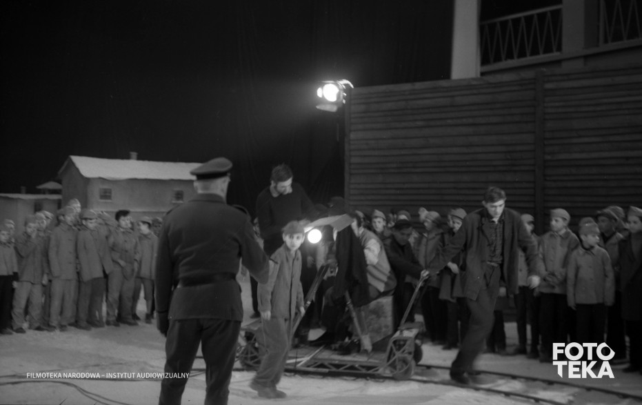 dzieci, obozy koncentracyjne, kamera, reflektor, tłum, szyny, scenografia, dekoracja, statyw, wózek do kamery, zbiórka