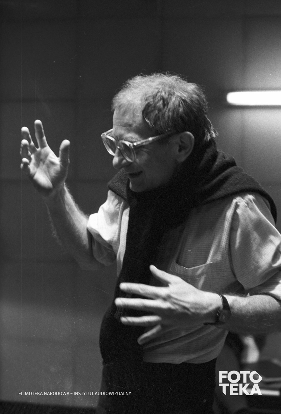 Opis: Werkfotos z planu filmu „Krótki film o zabijaniu” (1987), reż. Krzysztof Kieślowski. Reżyser podczas pracy na planie. Autor zdjęcia: Romuald Pieńkowski, czarno-biały negatyw, format 35 mm | On the set of “A Short Film About Killing” (1987), dir. Krzysztof Kieślowski. The director at work on set. Photo: Romuald Pieńkowski, black and white negative, 35 mm format