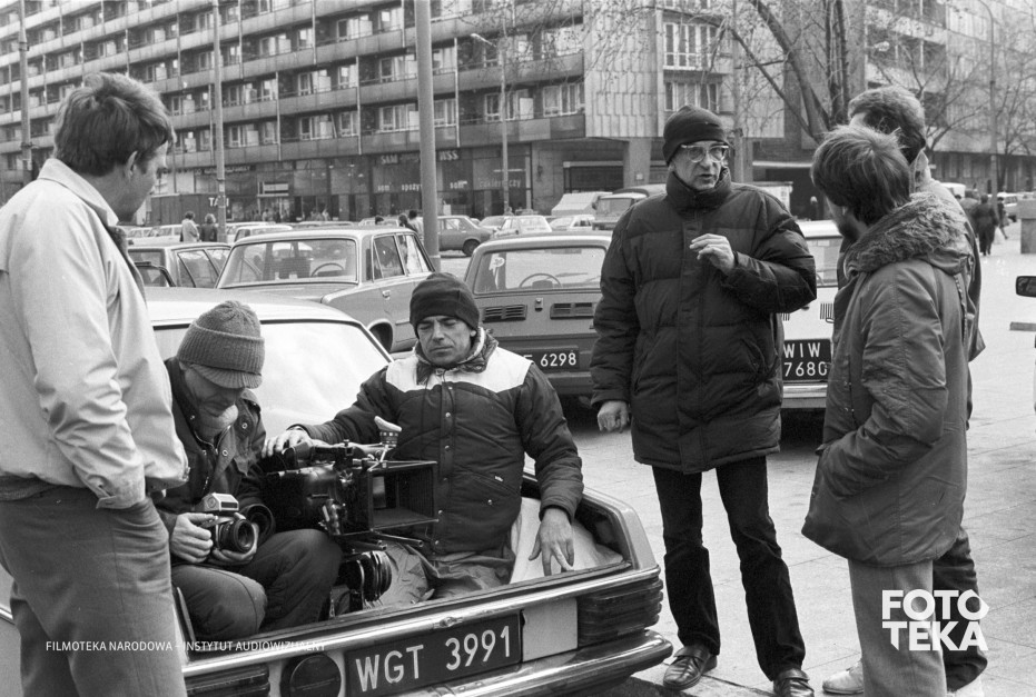 Opis: Werkfotos z planu filmu „Krótki film o zabijaniu” (1987), reż. Krzysztof Kieślowski. Ekipa podczas pracy na planie. Od lewej: NN, asystent operatora obrazu Henryk Jedynak, operator Sławomir Idziak , reżyser oraz NN. Autor zdjęcia: Romuald Pieńkowski, czarno-biały negatyw, format 35 mm | On the set of “A Short Film About Killing” (1987), dir. Krzysztof Kieślowski. Film crew at work on set. From left: unknown person, first assistant camera Henryk Jedynak, cinematographer Sławomir Idziak, the director and an unknown person. Photo: Romuald Pieńkowski, black and white negative, 35 mm format