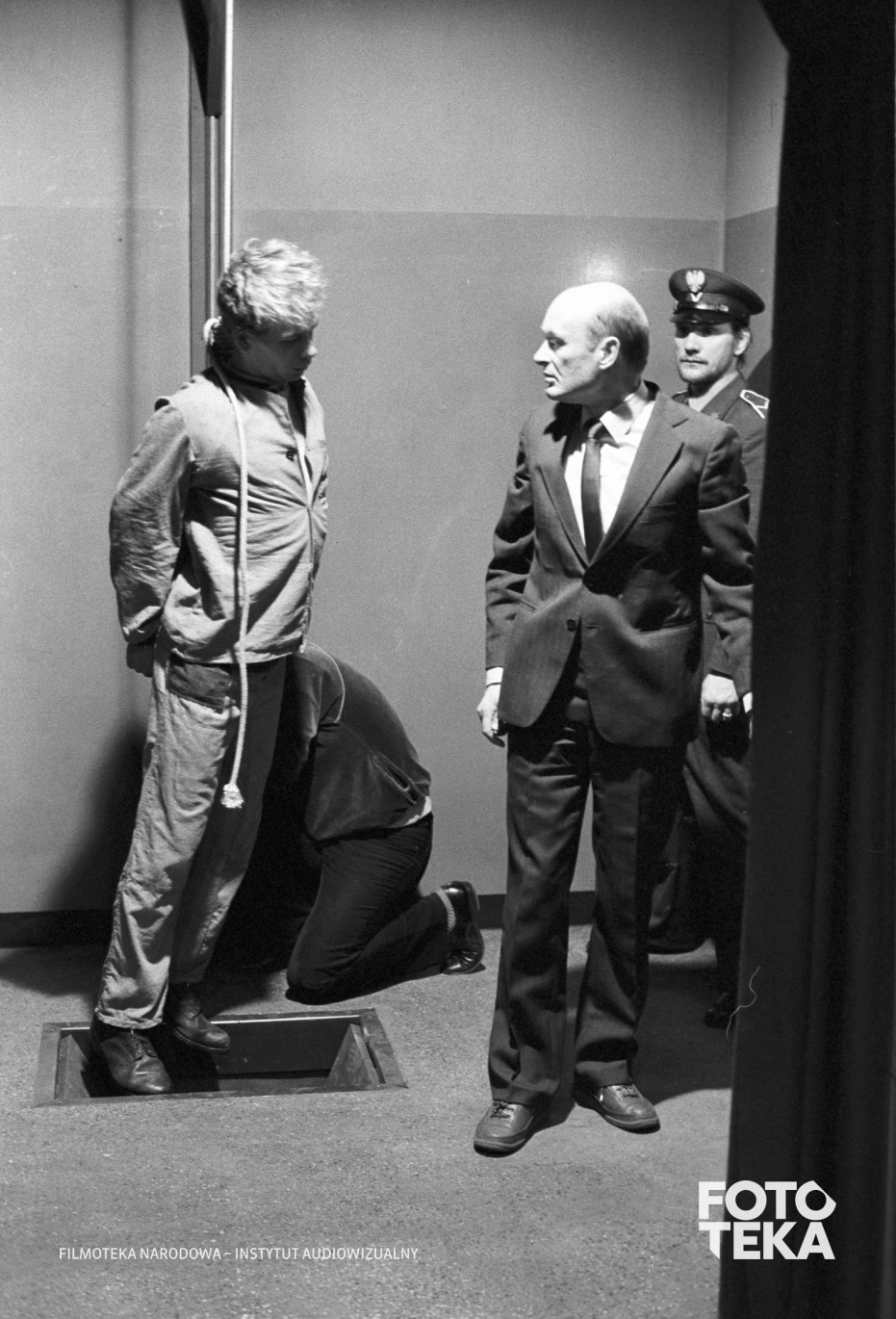 Opis: Fotos do filmu „Krótki film o zabijaniu” (1987), reż. Krzysztof Kieślowski. Scena egzekucji. Od lewej: aktorzy Mirosław Baka i Aleksander Bednarz. Autor zdjęcia: Romuald Pieńkowski, czarno-biały negatyw, format 35 mm | Film still from “A Short Film About Killing” (1987), dir. Krzysztof Kieślowski. Execution scene. From left: actors Mirosław Baka and Aleksander Bednarz. Photo: Romuald Pieńkowski, black and white negative, 35 mm format