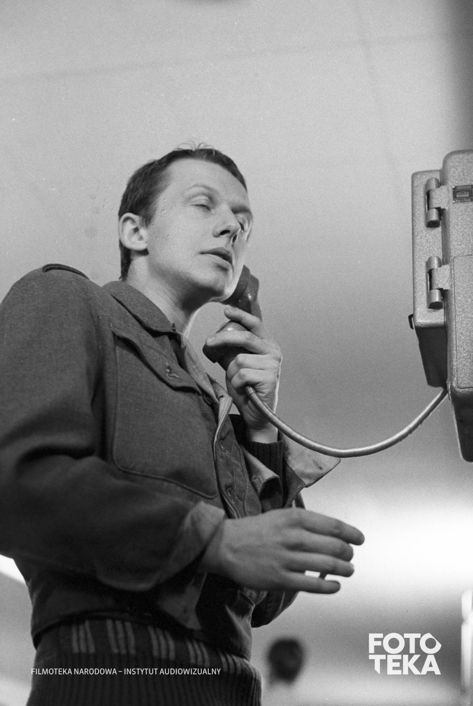 Opis: Fotos do filmu „Przypadek” (1981), reż. Krzysztof Kieślowski. Aktor Bogusław Linda w jednej ze scen filmu rozmawia przez telefon. Autor zdjęcia: Romuald Pieńkowski, czarno-biały negatyw, format 35 mm | Film still from “Blind Chance” (1981), dir. Krzysztof Kieślowski. Actor Bogusław Linda talks over the phone in one scene. Photo: Romuald Pieńkowski, black and white negative, 35 mm format