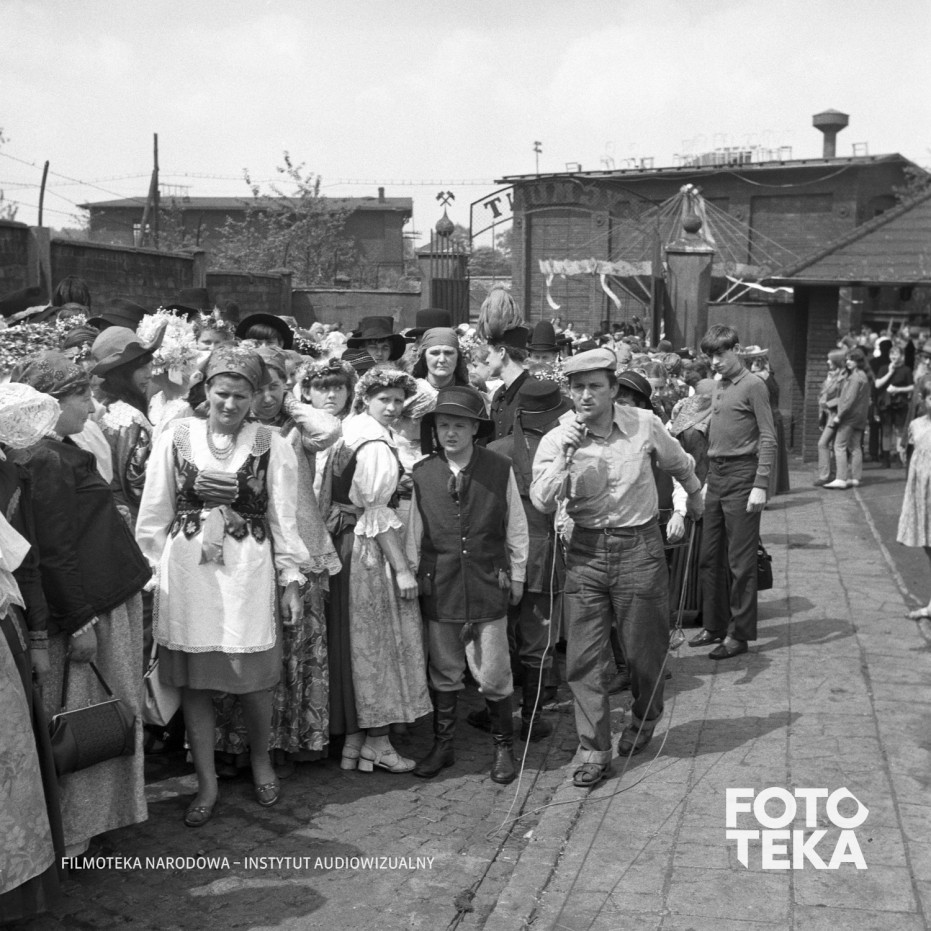 mikrofon, kopalnia, tłum, strój ludowy, ekipa filmowa