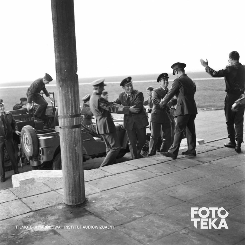 - Kaczmarek Jerzy (przy kolumnie, wita się), aktor, rola pilot
